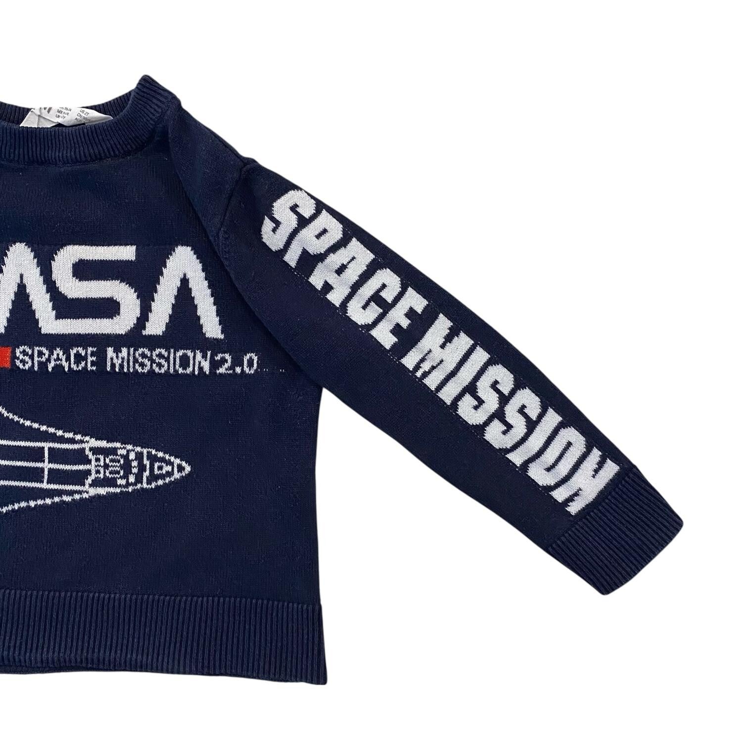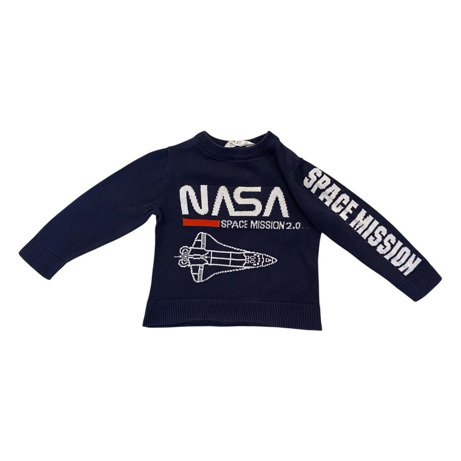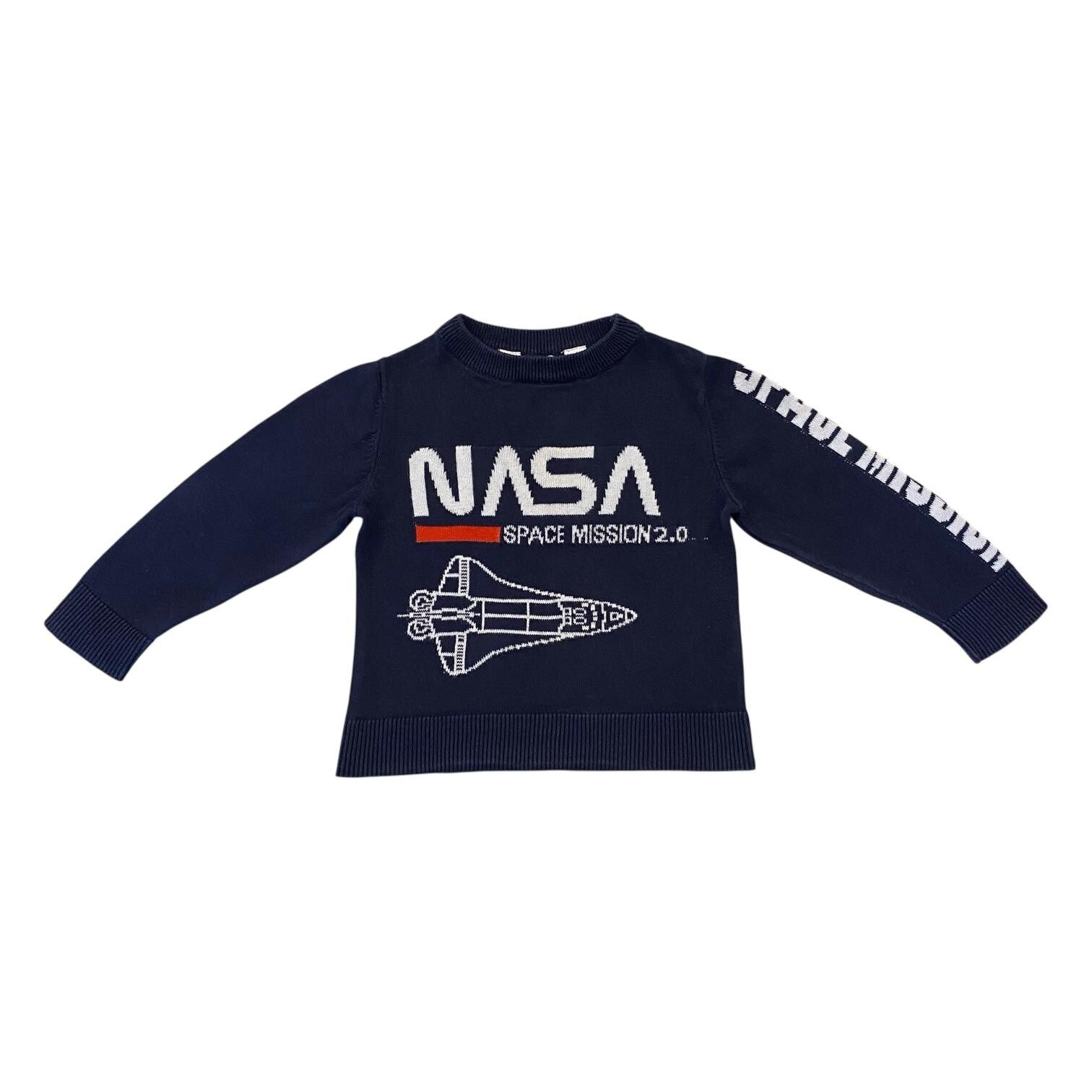 Feinstrickpullover mit Space-Shuttle-Motiv und der Aufschrift "NASA" und "SPACE MISSION 2.0" auf der Vorderseite, sowie der Aufschrift "SPACE MISSION" auf dem linken Ärmel