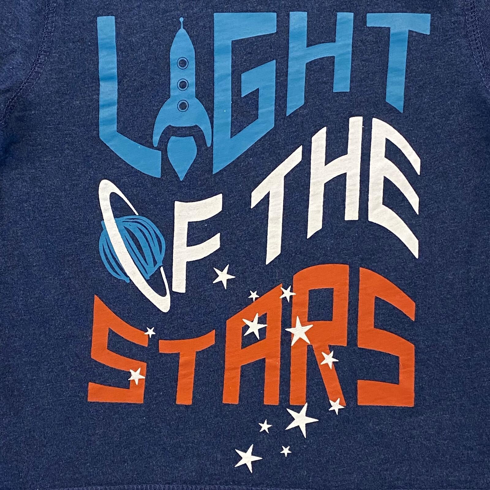 Langarmshirt mit der Aufschrift "LIGHT OF THE STARS", einer Rakete, Sterne und einem Planeten als Motiv, elastische Rippbündchen an den Ärmeln und am Kragen, sowie zwei Druckknöpfe an der linken Schulter für leichteres An- und Ausziehen