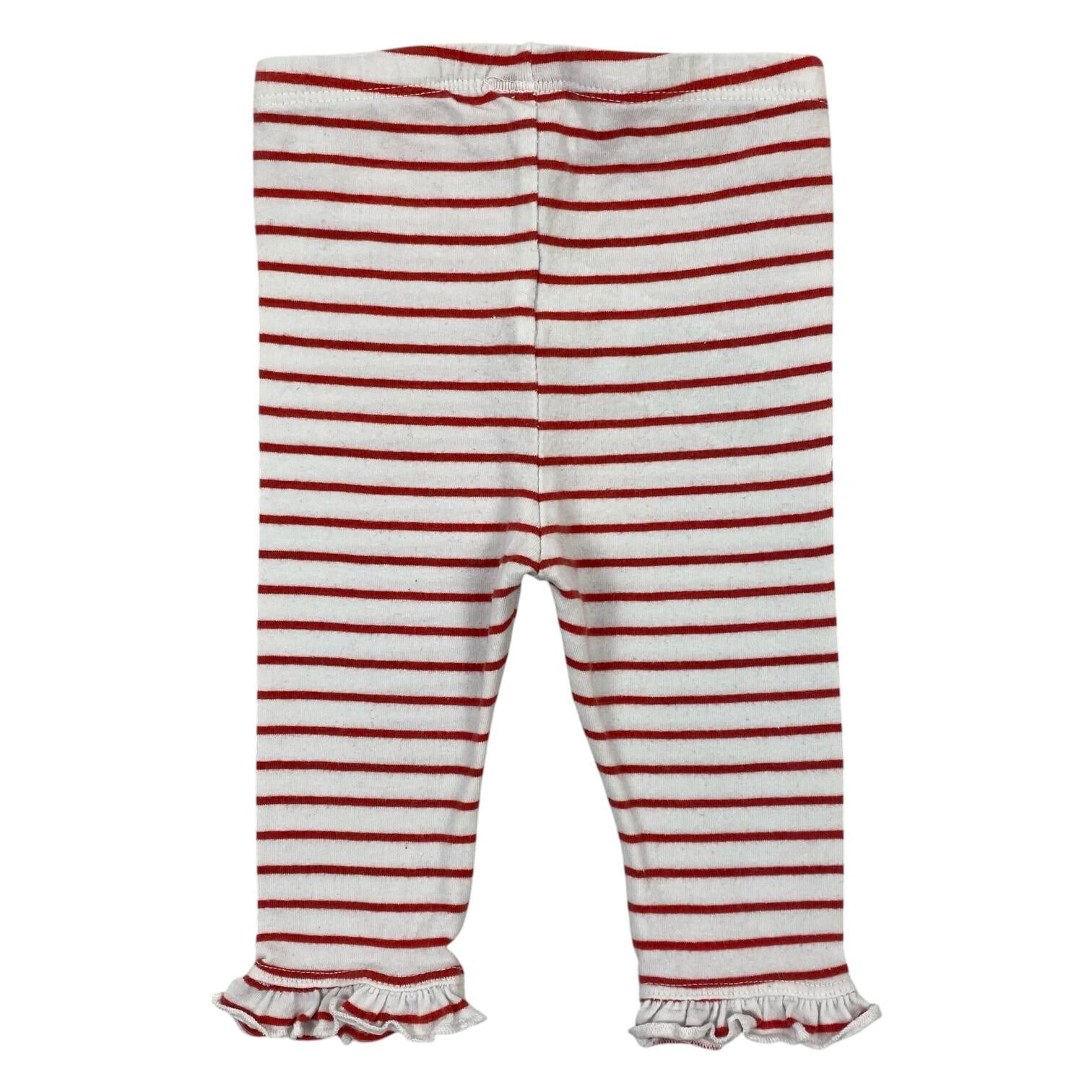 Weiße Leggings mit Streifenmuster in der Farbe Rot, elastischem Bund sowie elastischen Beinabschlüssen mit Rüschen